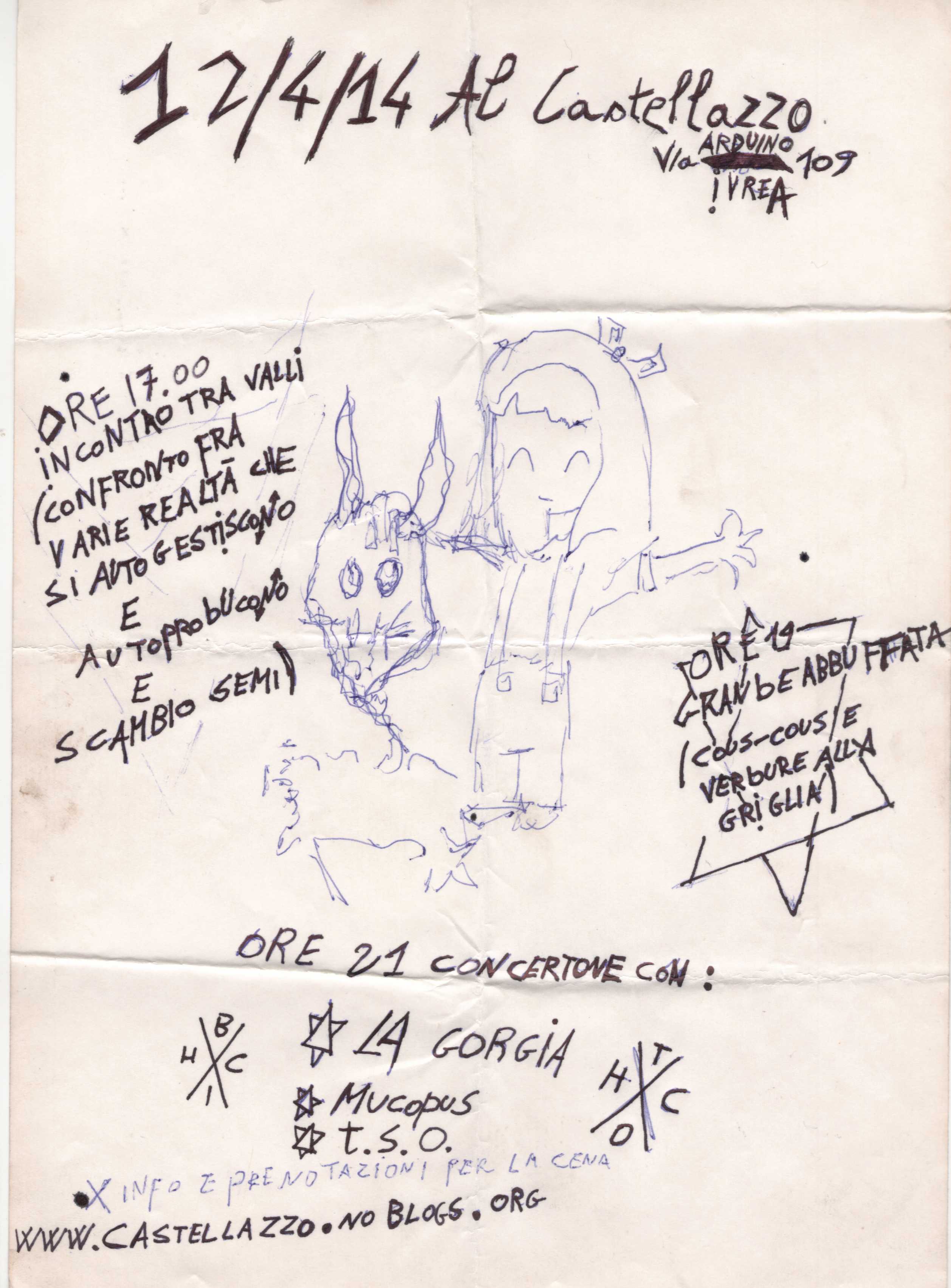 Ore 14.00 Incontro tra valli (Confronto tra realtà che si autogestiscono e che autoproducono + scambio semi); Ore 19.00 Cena sociale (Cous cous + verdure alla griglia)… sono gradite prenotazioni sul blog; Ore 21.00: Concerto Punk-Hc con Esalazione (Ge) + Mucopus (To) + TSO (Bi)